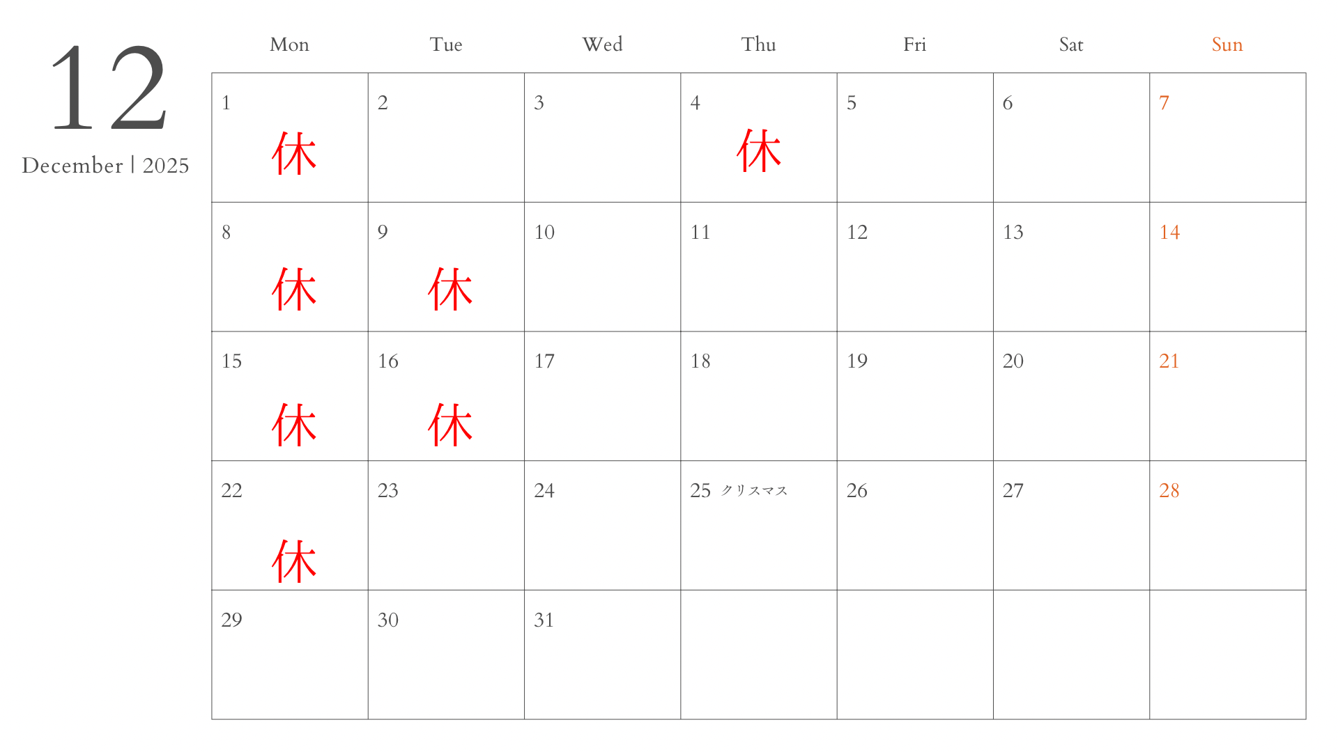 12月定休日 29日(月)〜31日(水)時短営業 年始は6日(火)から営業